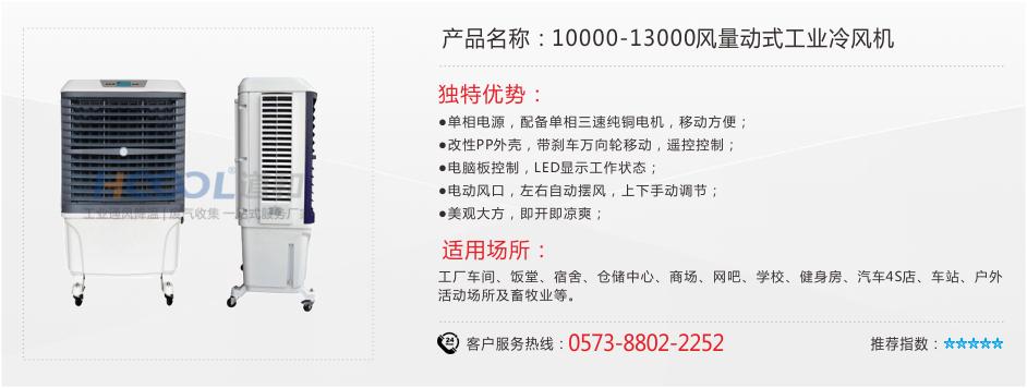 · 移動(dòng)冷風(fēng)機(jī)除了可以讓企業(yè)車間、公共場(chǎng)所、商業(yè)娛樂(lè)場(chǎng)合帶來(lái)新鮮空氣和降低溫度之外,還有一個(gè)重要特點(diǎn)—-節(jié)能、環(huán)保!它是一款全新無(wú)壓縮機(jī)、無(wú)冷媒、無(wú)銅管的環(huán)保產(chǎn)品,主要部件核心—–蒸發(fā)式濕簾(多層波紋纖維疊合物)及1.1KW的主電機(jī)/是傳統(tǒng)中央空調(diào)耗電一部分,能為各行業(yè)更實(shí)在的省電。